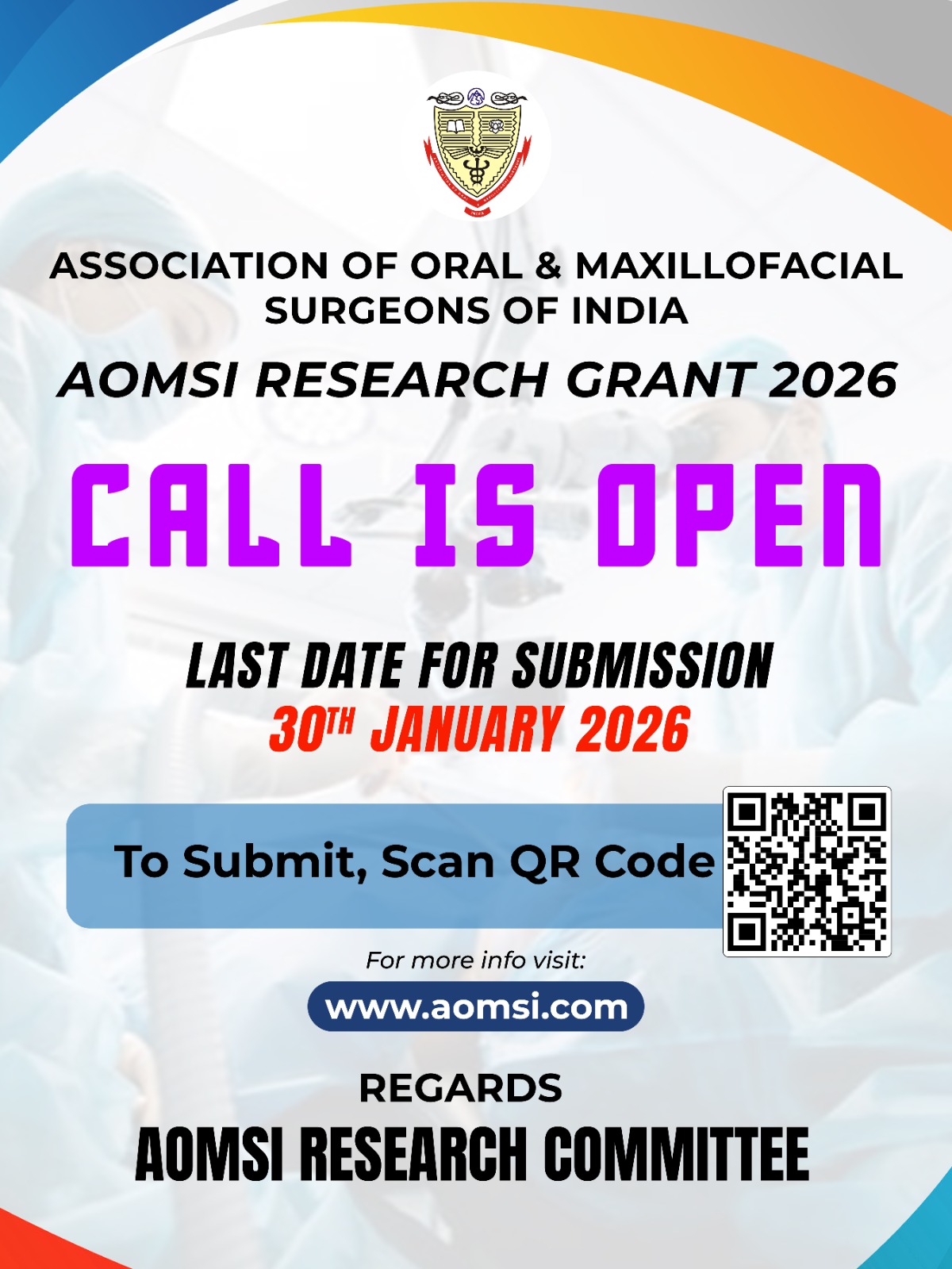 Call for AOMSI Research Grant is open for the year 2026. All are invited to explore opportunity to submit proposal for seed grant till 30th December 2025. Looking forward to receive maximum number of Good quality proposals.